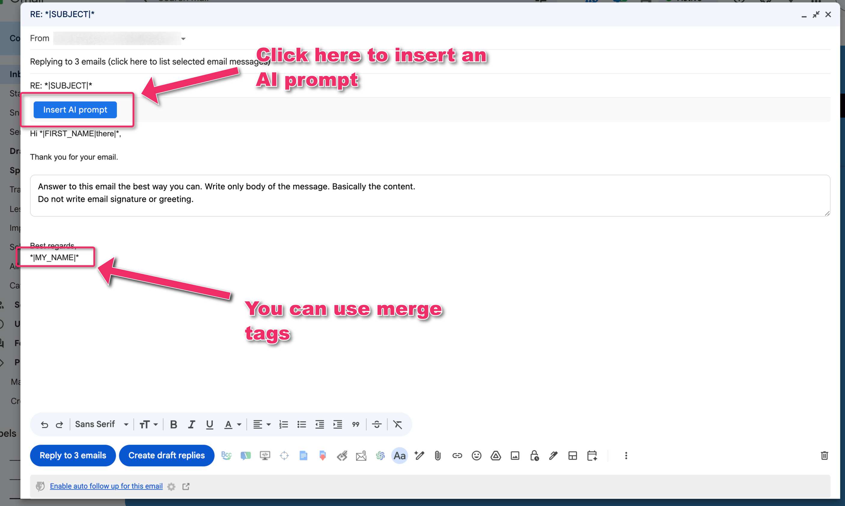One of the most powerful features of our system is using AI prompts to generate the entire email or just portion of email. That is espectially useful when you want that each answer is tailoer to the actual email you have receive. So you can have a prompt like this:
