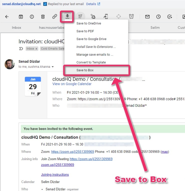 - Open your email and click the “Save to” button on your Gmail and click “Save to Box“: