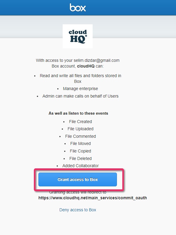 - Authorize cloudHQ in Box: