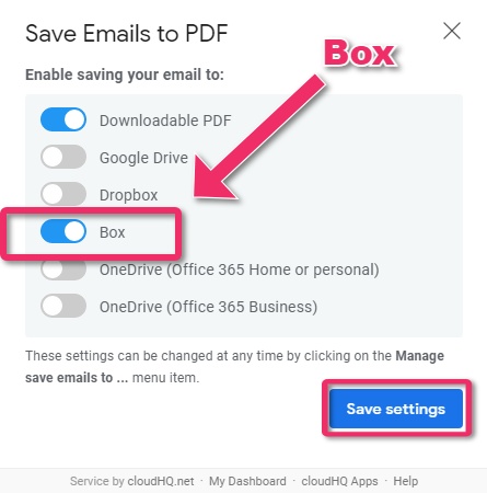 - Enable saving your emails to Box and click Save settings.