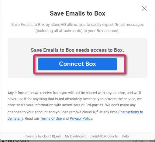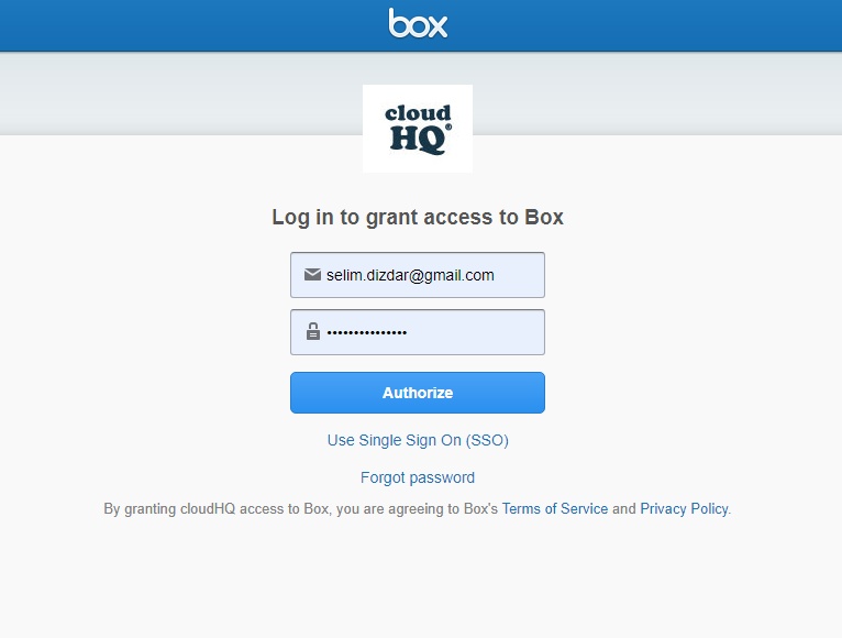 - Log in to grant access to Box. By granting cloudHQ access to Box you are agreeing to Box’s Terms of Service and Privacy Policy: