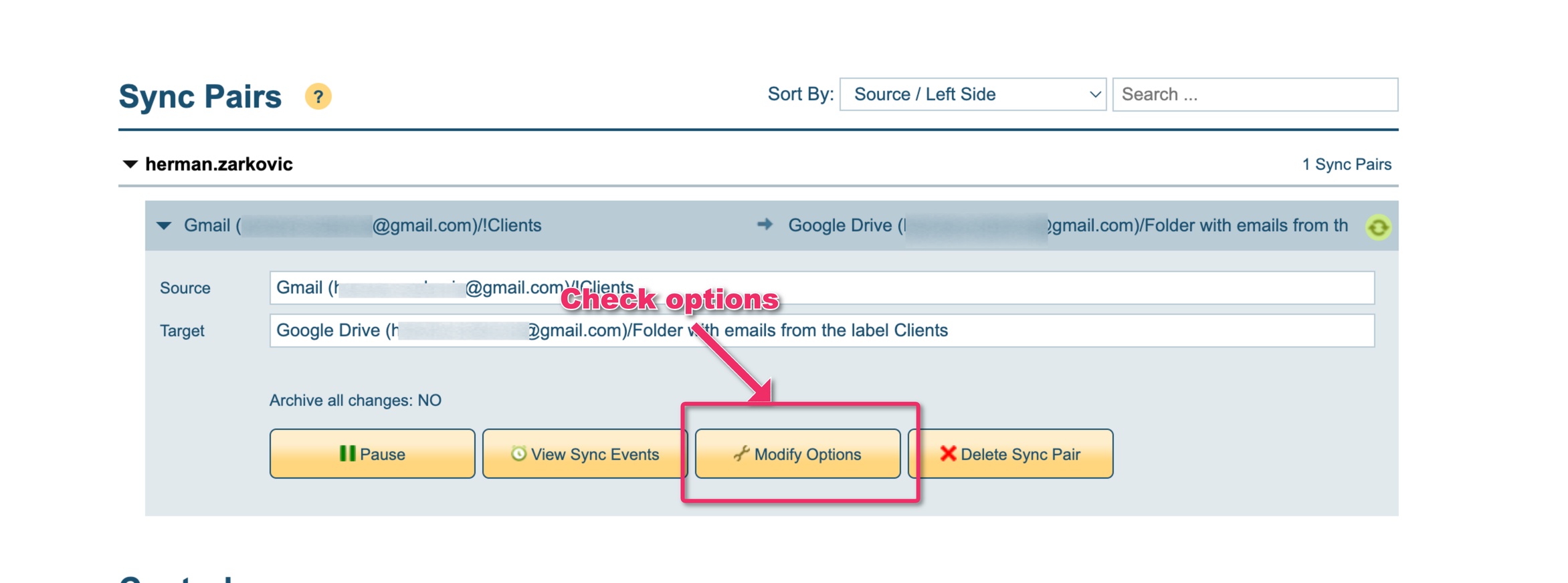 - Check if the sync pair is running. A sync pair defines which Gmail label is saved where. To check the status of your sync pair, log in to cloudHQ and open the Sync & Backup tab.